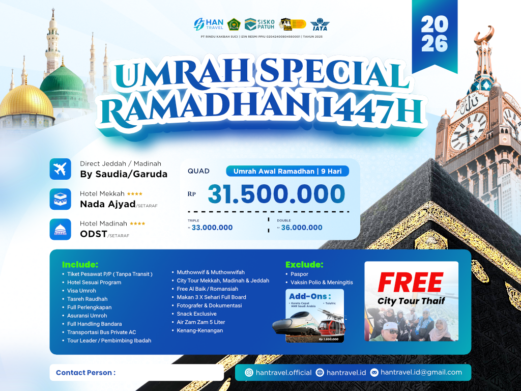 - 30 hari sebelum tanggal keberangkatan, dikenakan biaya pembatalan sebesar 25% dari harga paket.
