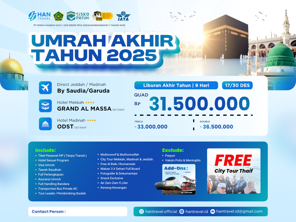 - 30 hari sebelum tanggal keberangkatan, dikenakan biaya pembatalan sebesar 25% dari harga paket.